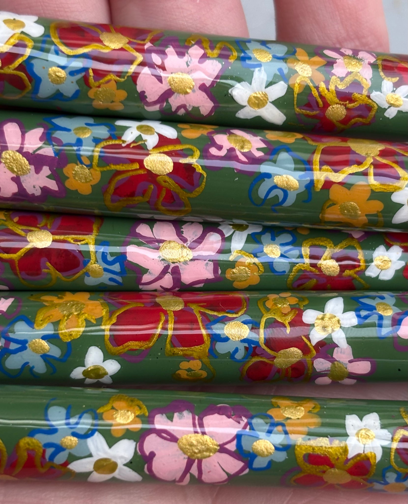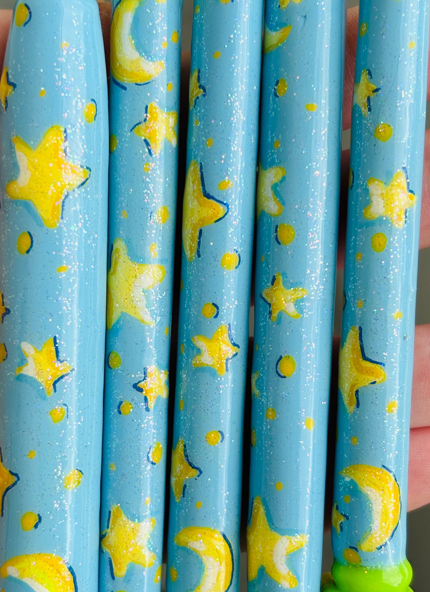 Handmade from polymer clay with painted/glittered details.